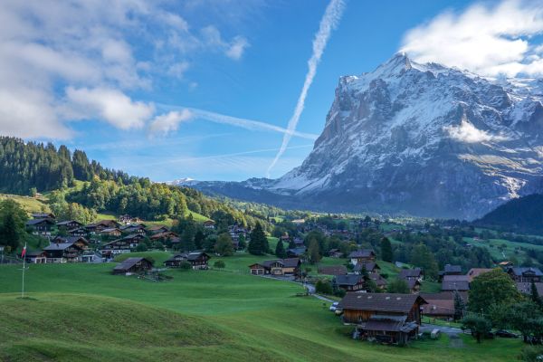 בשעות אחר הצהריים של אותו יום שהחל בגשם ושלג, לפני שאני נפרדת מגרינדלוולד, השמש כובשת את השמיים ומשאירה רק כמה עננים צחורים לקישוט. כמויות המשקעים הגדולות שירדו ניקו את האוויר וצבעו את השמיים בכחול עמוק להדהים. אני מתקשה להיפרד, מסתובבת עוד קצת בעיירה, מביטה על ההרים, מצלמת.
