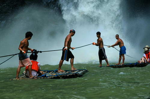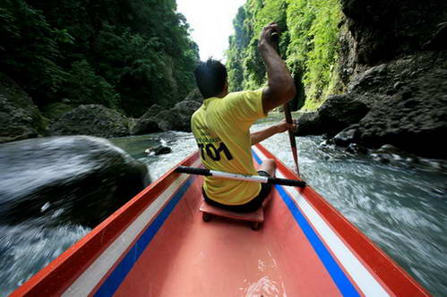 הנוף בנהר עוצר נשימה. מפלי מים, כפרים קטנים עם בקתות קש על גדות הנהר, דייגים עם סירות קנו זעירות וקולות של ג'ונגל. המעבר באשדים ובמים המקפצים, נעשית על ידי השניים במיומנות מדהימה. בחלק מהאשדים הקנו שלנו ממש מרחף באוויר על גבי צינורות מבמבוק. השייט היושב מלפנים עושה כל הזמן הצגות כמה קשה הוא עובד. אחרי כחצי שעה נקודת סחיטה במעלה הנהר: "לא תקנה לשייט המסכן קוקה-קולה?", באה השאלה מהסחטן התורן. "לא!" הייתה התשובה. "לא תאכל איזה עוף בגריל?", שאלה שנייה גם כאן התשובה שלילית. "לא תשתה איזה קוקוס טרי מהג'ונגל?", הייתה השאלה השלישית וגם כאן התשובה היא לא. טוב שבנקודה זו לא נשברנו. המשך המסע היה כבר ללא הפרעות מיותרות. אחרי עוד כחצי שעה של שיט קנו במעלה הנהר, הגענו למפל מרהיב של מים שוצפים. כדי להרגיש את החוויה, הוזמנו לשלם עוד 90 פזו ובאמצעות רפסודה הקשורה בחבל, מוסעים לתוך המפל וחזרה.