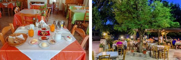 עם בואנו, המתינה לנו בעלת הבית, והראתה לנו בגאווה את המלון. מרגע שהתיישבנו החלו המאכלים להגיע, בשפע, בטעם, ובמגוון שלא מבייש כל מסעדה מפוארת. גבינות וירקות הונחו לשולחן, ומיד אחריהם מיני מאכלים מבשר כבש, ירקות מבושלים ברוטב, והדובדבן שבקצפת - ממולאים, כולל פרחי קישוא ממולאים. על השולחן הונח קנקן ראקי, וקנקן מים קרים.