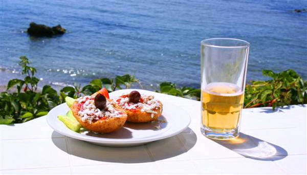 בדרכנו לעיר חאניה, עצרנו באחד החופים, לשתות ולאכול משהו קטן. ביקשנו משהו קל, אופייני לכרתים, וקיבלנו את המאכל שליווה אותנו בכל ארוחה, וממשיך להיות הדבר האהוב על נכדינו, שכבר יודעים את שמו: דאקוס.
