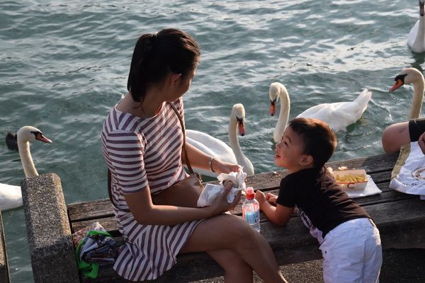 צעירי ציריך נאספים ליד האגם ביום קיץ חם במיוחד והברבורים תרים אחר תורם נדיב... (צילום: כרמית וייס)