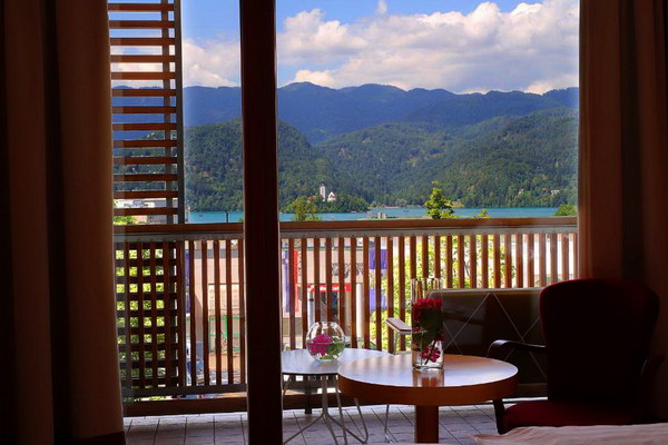 אגם בלד והכנסייה על האי שבמרכזו, תצפית ממרפסת אחד החדרים של מלון לובץ' בעיירה בלד