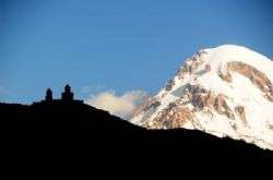 כנסיית השילוש הקדוש על רקע הר קזבק, שגובהו 5,047 מטר והוא השלישי בגובהו בגאורגיה (צילום: תומר וייס)
